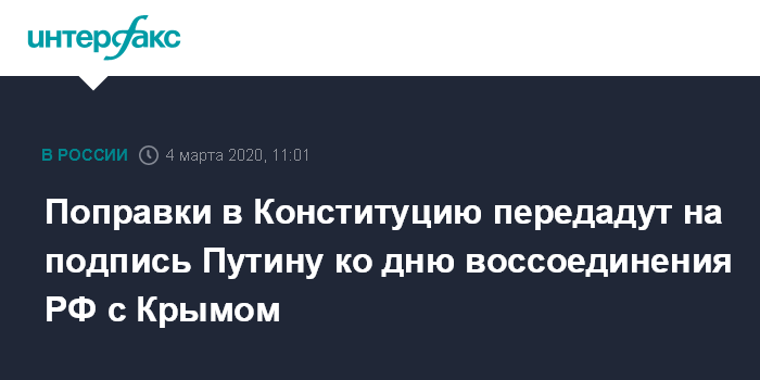 Москва. 4 марта. INTERFAX.RU - Пакет поправок в Конституцию РФ, в случае их одобрения в парламенте и положительного заключения Конституционного суда, планируется передать на подпись президенту РФ Владимиру Путину к 18 марта, сообщил "Интерфаксу" в среду источник в рабочей группе по поправкам в Основной закон страны.