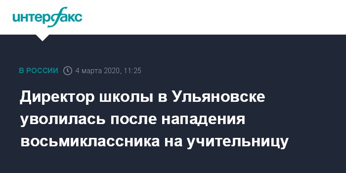 Москва. 4 марта. INTERFAX.RU - В Ульяновске директор школы №81 уволилась после того, как ученик восьмого класса на уроке напал с ножом на учительницу. Об этом сообщили в пресс-службе мэрии города.