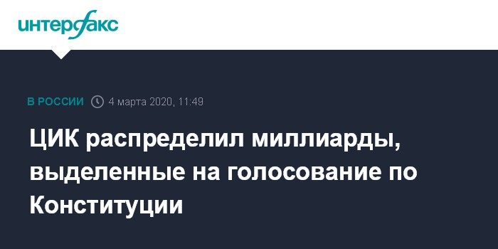 Москва. 4 марта. INTERFAX.RU - Центризбирком распределил 14 816 329 200 рублей, выделенных из бюджета на общероссийское голосование по поправкам в Конституцию. Постановление об этом комиссия приняла 4 марта.