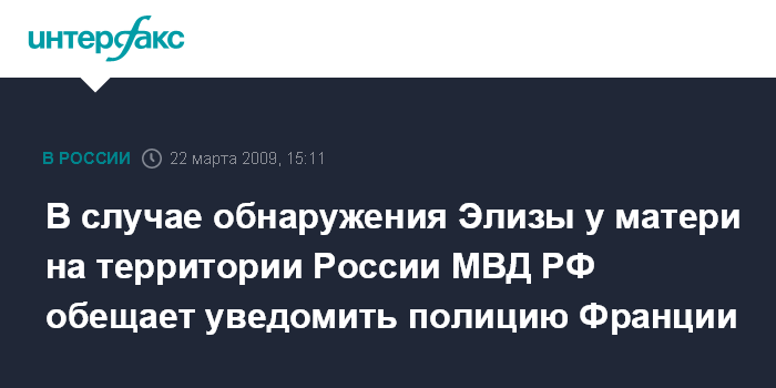 Москва. 22 марта. INTERFAX.RU - Российские правоохранительные органы примут все необходимые меры к розыску похищенной во Франции трехлетней Элизы в случае поступления соответствующего запроса от полиции Франции, заверяют в МВД РФ.