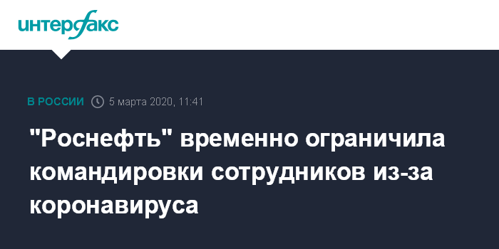 Москва. 5 марта. INTERFAX.RU - "Роснефть" из-за коронавируса ограничила отправку сотрудников в зарубежные командировки, за исключением случаев крайней производственной необходимости. Об этом сообщила пресс-служба компании.