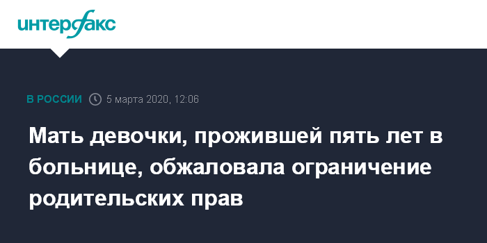 Москва. 5 марта. INTERFAX.RU - Мать девочки, которая все пять лет своей жизни находится в перинатальном центре в Москве, подала апелляционную жалобу на решение суда об ограничении своих родительских прав и передачу ребёнка на попечение в органы опеки, сообщили "Интерфаксу" в суде.