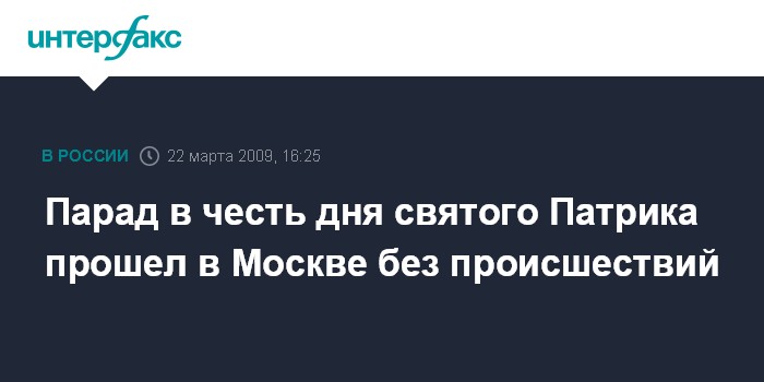 Москва. 22 марта. INTERFAX.RU - В российской столице закончился парад, проходивший в честь дня святого Патрика, сообщили в воскресенье "Интерфаксу" в управлении информации и общественных связей ГУВД Москвы.