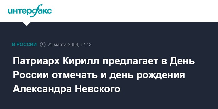Калининград. 22 марта. INTERFAX.RU - Патриарх Московский и всея Руси Кирилл предложил учредить в День России 12 июня дополнительный церковный праздник - празднование дня рождения святого Александра Невского.