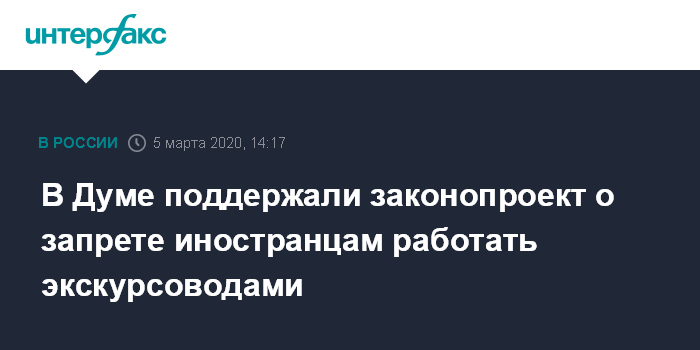 Москва. 5 марта. INTERFAX.RU - Думский комитет по физкультуре, спорту, туризму и делам молодежи одобрил к первому чтению законопроект, который разрешает работать экскурсоводом только лицам с российским гражданством и обязывает их проходить аттестацию.