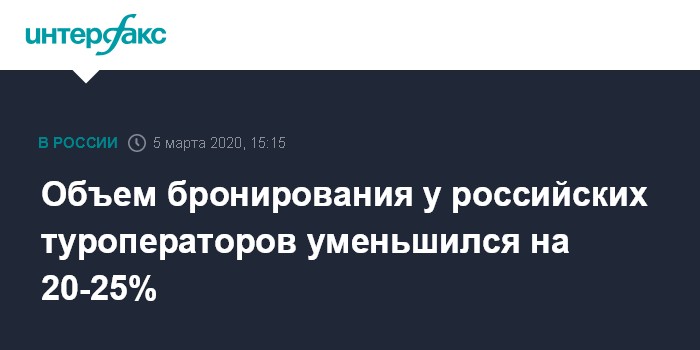 Москва. 5 марта. INTERFAX.RU - Из-за коронавируса и напряженных отношений с Турцией общий объем бронирований у туроператоров сократился на 20-25%, сообщила исполнительный директор Ассоциации туроператоров России (АТОР) Майя Ломидзе. Она уточнила, что речь идет о всех направлениях.