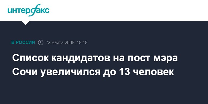 Сочи. 22 марта. INTERFAX.RU - В избирательную комиссию города Сочи поступили уведомления еще от двух претендентов на пост мэра.