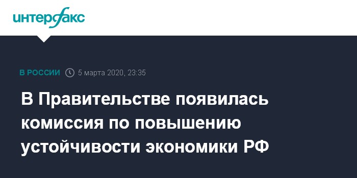 "Правительственная комиссия по повышению устойчивости российской экономики образована постановлением правительства от 5 марта 2020 года №236 для осуществления координации деятельности органов исполнительной власти и взаимодействия с представителями научных и общественных организаций, предпринимательским сообществом при разработке и реализации мероприятий, направленных на повышение устойчивости развития финансового сектора и отдельных отраслей экономики, в том числе связанных с распространением коронавирусной инфекции", - говорится в сообщении.