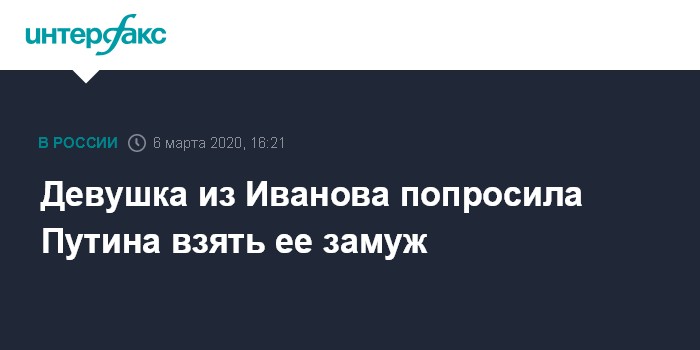 Москва. 6 марта. INTERFAX.RU - Жительница Ивановa попросила президента Владимира Путина взять ее замуж, пока он общался с населением после осмотра отремонтированной детской поликлиники.