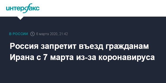 Москва. 6 марта. INTERFAX.RU - Россия с 7 марта закрывает границу для граждан Ирана "в целях обеспечения безопасности государства, защиты здоровья населения и нераспространения новой коронавирусной инфекции" на территории РФ.