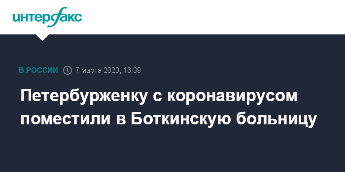 Москва. 7 марта. INTERFAX.RU - Жительница Санкт-Петербурга, вернувшаяся из Италии с коронавирусом, находится в Боткинской больнице, сообщили "Интерфаксу" в пресс-службе регионального управления Роспотребнадзора в субботу.