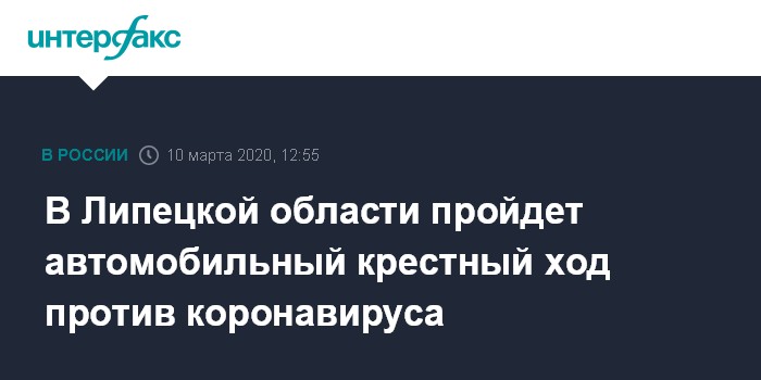 Москва. 10 марта. INTERFAX.RU - Православные проведут автомобильный крестный ход по Липецкой области против распространения коронавинуса, об этом изданию Gorod 48 сообщил глава липецкой общины Святых царственных мучеников Юрий Берников.