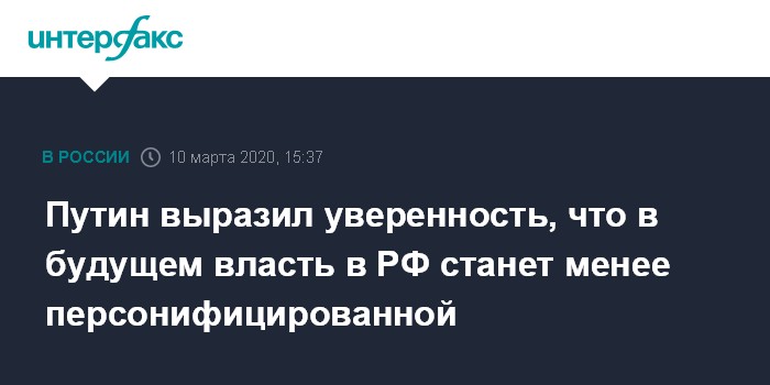 Москва. 10 марта. INTERFAX.RU - Президент РФ Владимир Путин выразил уверенность, что со временем высшая власть в России не будет персонифицирована.