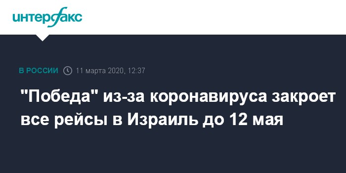 Москва. 11 марта. INTERFAX.RU - "Победа" приостанавливает все свои рейсы из Москвы в Эйлат с 12 марта по 12 мая 2020 года в связи с решением правительства Израиля о запрете на въезд туристов из-за ситуации с коронавирусом, сообщила представитель компании журналистам.