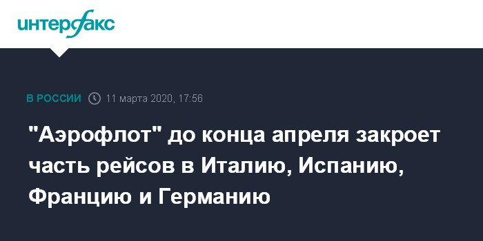 Москва. 11 марта. INTERFAX.RU - "Аэрофлот" с 13 марта до конца апреля приостановит рейсы в некоторые города Италии, Испании, Франции и Германии, сообщила авиакомпания.