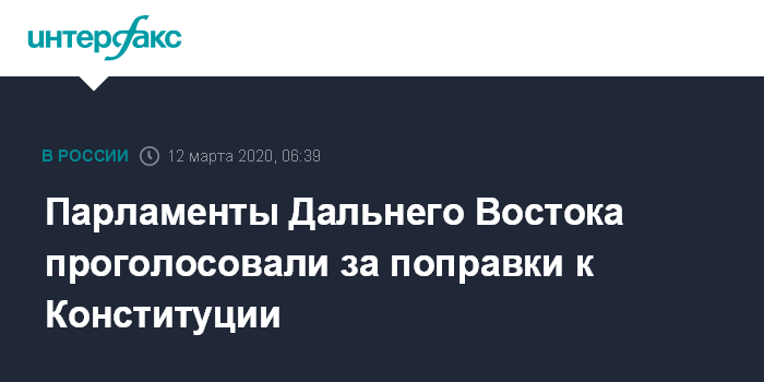 Москва. 12 марта. INTERFAX.RU - Депутаты региональных заксобраний на Дальнем Востоке поддержали большинством голосов закон о поправке к Конституции РФ "О совершенствовании регулирования отдельных вопросов организации и функционирования публичной власти".