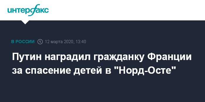 Москва. 12 марта. INTERFAX.RU - Президент Владимир Путин наградил орденом Дружбы гражданку Франции Катрин Иванов-Тротиньон, которая оказалась среди заложников в театральном центре на Дубровке в октябре 2002 года и сумела спасти там детей.