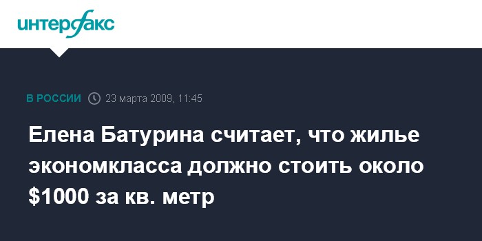 Москва. 23 марта. INTERFAX.RU - Президент компании "Интеко" Елена Батурина считает, что жилье экономкласса должно стоить около $1000 за кв. метр.