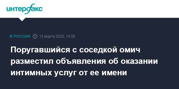 Москва. 13 марта. INTERFAX.RU - Полиция возбудила уголовное дело о клевете в отношении 37-летнего жителя Омска, который не поделил землю с соседкой и отомстил, разместив от ее имени объявление об оказании интимных услуг. Об этом сообщила пресс-служба областного управления МВД.