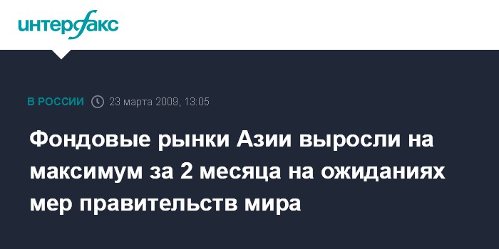 Москва. 23 марта. INTERFAX.RU - Темпы роста азиатских фондовых индексов были в понедельник самыми быстрыми за 2 месяца на фоне оптимизма, связанного с мерами правительств по всему миру, направленными на стимулирование экономики, сообщает агентство Bloomberg.