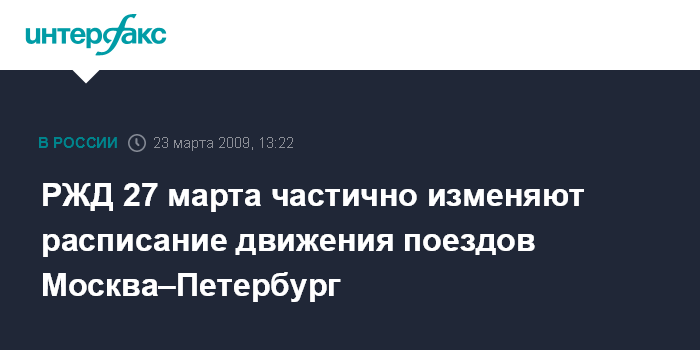 РЖД 27 марта частично изменяют расписание движения поездов Москва–Петербург