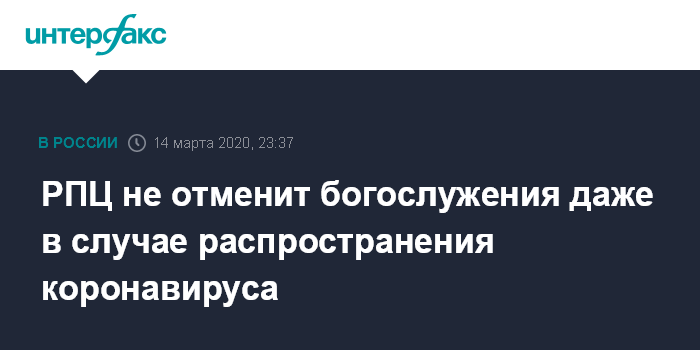 Москва. 14 марта. INTERFAX.RU - Духовенство Русской православной церкви (РПЦ) не откажется от совершения литургии даже в случае распространения коронавируса COVID-19, заявил глава синодального Отдела внешних церковных связей митрополит Иларион в эфире программы "Церковь и мир" на телеканале "Россия-24".