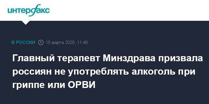 Москва. 15 марта. INTERFAX.RU - Главный терапевт Минздрава России Оксана Драпкина призвала отказаться от алкоголя при появлении симптомов гриппа или ОРВИ.