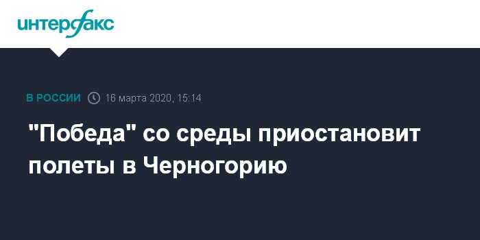 Москва. 16 марта. INTERFAX.RU - Авиакомпания "Победа" с 18 марта приостанавливает полеты из Москвы в Тиват в связи с введенным правительством Черногории запретом на въезд иностранных граждан, сообщила журналистам представитель компании.