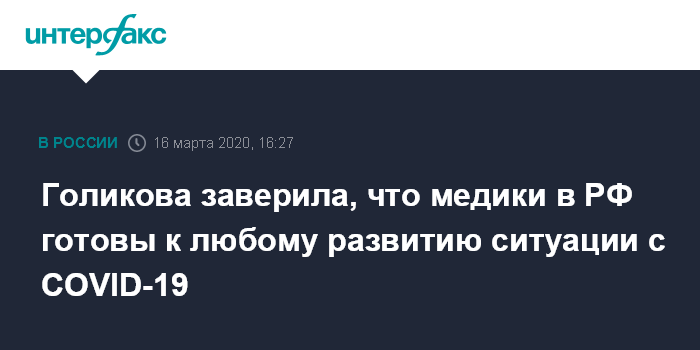 Москва. 16 марта. INTERFAX.RU - Медицинские организации в России готовы к любому развитию ситуации с коронавирусом, сообщила вице-премьер РФ Татьяна Голикова.