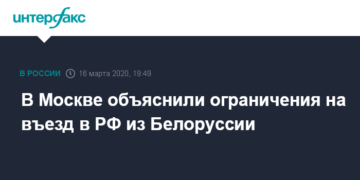 Москва. 16 марта. INTERFAX.RU - Ограничения на въезд в Россию с территории Белоруссии вводятся из-за невыполнения официальным Минском рекомендации ВОЗ по перекрытию госграниц, сообщили в правительстве РФ.