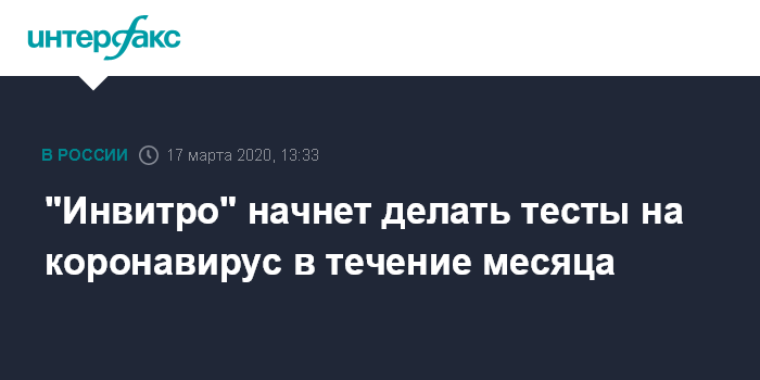 Москва. 17 марта. INTERFAX.RU - "Инвитро" начнет делать тесты на коронавирус в течение месяца, сообщили в пресс-службе компании.