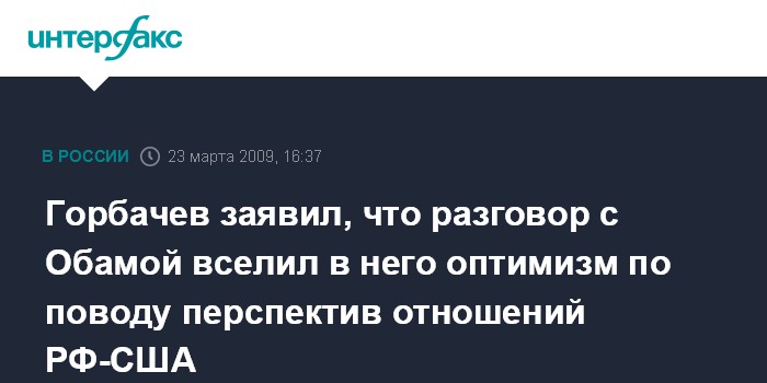 "Хороший был разговор. У меня сейчас оптимизма еще больше, что отношения будут менять в лучшую сторону. У него (Б.Обамы - ИФ) настроение улучшать их, и это он собирается обсуждать на двусторонней встрече с нашим президентом", - сообщил М.Горбачев в понедельник "Интерфаксу".