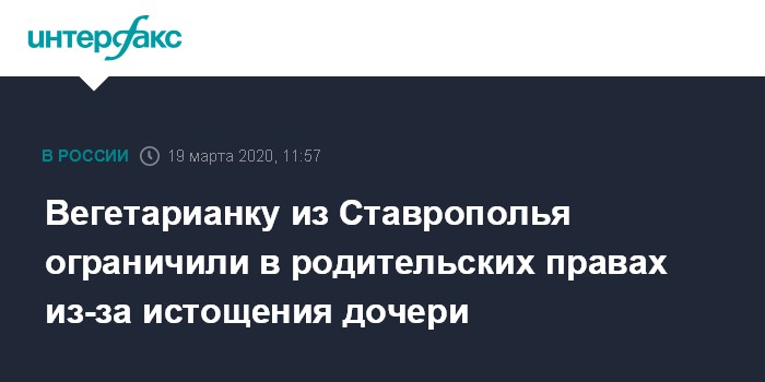 Ранее детский омбудсмен края Светлана Адаменко сообщала агентству о том, органы опеки и попечительства Кисловодска, руководствуясь статьей 77 Семейного кодекса, изъяли ребенка у матери-вегетарианки и потребовали через суд лишить ее родительских прав. Такое решение было принято, поскольку полуторагодовалая девочка была истощена и весила вдвое меньше нормы.