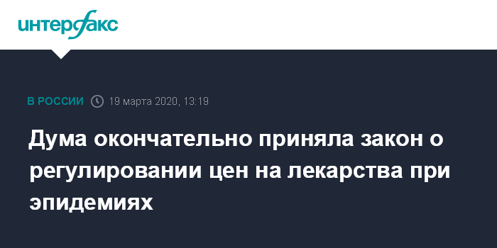Москва. 19 марта. INTERFAX.RU - Госдума на заседании в четверг приняла в окончательном, третьем чтении приоритетный закон, который наделяет правительство правом ограничивать максимальные цены на нежизненно важные лекарства и медицинские изделия в случае угроз распространения эпидемий, подобных коронавирусу, или при чрезвычайных ситуациях.