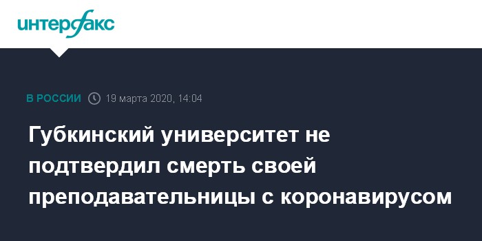Москва. 19 марта. INTERFAX.RU - Российский государственный университет нефти и газа им.Губкина не располагает информацией о том, что в московской больнице умерла 79-летняя профессор университета, у которой ранее был диагностирован коронавирус.