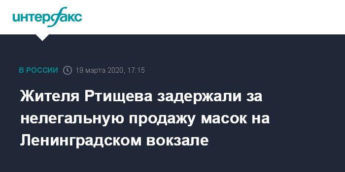 Москва. 19 марта. INTERFAX.RU - В Москве на Ленинградском вокзале полиция задержала жителя Ртищева, который продавал медицинские маски без разрешения. Об этом сообщили в транспортном управлении МВД по Центральному федеральному округу.