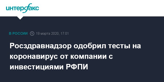 Москва. 19 марта. INTERFAX.RU - Федеральная служба по надзору в сфере здравоохранения (Росздравнадзор) одобрила для применения в России диагностическую систему для выявления коронавируса, разработанную ООО "Медпромресурс", сообщил Российский фонд прямых инвестиций (РФПИ), инвестировавший в эту компанию.