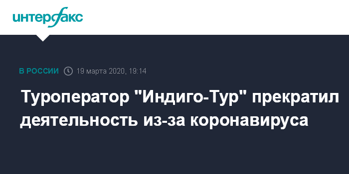 Москва. 19 марта. INTERFAX.RU - Туроператор "Индиго-Тур" сообщил о прекращении деятельности, поскольку не может исполнять своих обязательства в условиях снижения спроса и закрытия многих азиатских направлений.