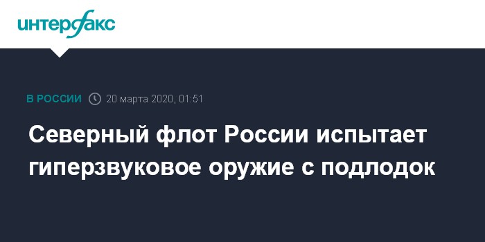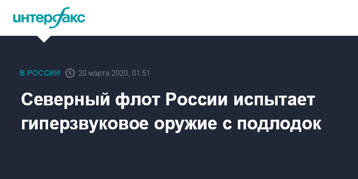 Москва. 20 марта. INTERFAX.RU - Подводные лодки Северного флота России в ближайшее время планируют приступить к испытаниям гиперзвукового оружия, сообщил командующий флотом вице-адмирал Александр Моисеев.