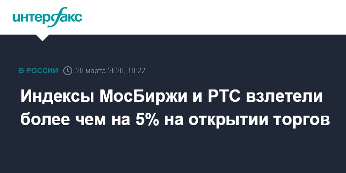 Москва. 20 марта. INTERFAX.RU - В пятницу торги на российском рынке сакций открылись резким ростом цен blue chips на фоне восстановления мировых площадок и нефти благодаря потоку стимулирующих мер центробанков, индексы МосБиржи и РТС за минуту торгов прибавили больше 5%.