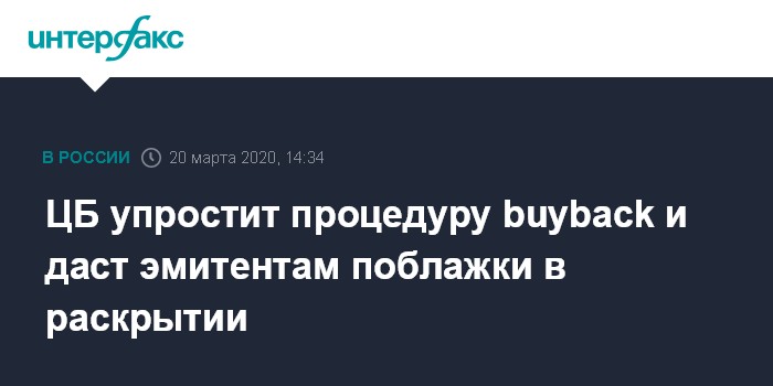 Москва. 20 марта. INTERFAX.RU - Банк России предлагает проводить в 2020 году операции обратного выкупа своих акций на бирже по упрощенной процедуре, сообщила пресс-служба регулятора.