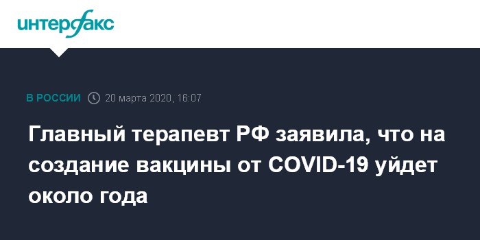 Главный терапевт РФ заявила, что на создание вакцины от COVID-19 уйдет около года