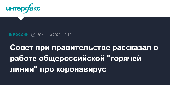 Москва. 20 марта. INTERFAX.RU - Жители России смогут задать любой вопрос о коронавирусной инфекции COVID-19 и карантинных мероприятиях операторам организованной правительством России "горячей линии", сообщили журналистам в Координационном совете при правительстве РФ.