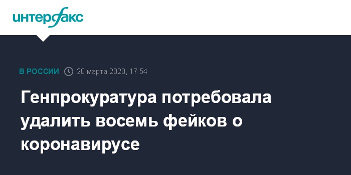 Москва. 20 марта. INTERFAX.RU - Генпрокуратура направила в Роскомнадзор восемь требований отреагировать на распространение ложной информации о коронавирусе под видом достоверных сообщений. Об этом "Интерфаксу" сообщили в надзорном ведомстве.