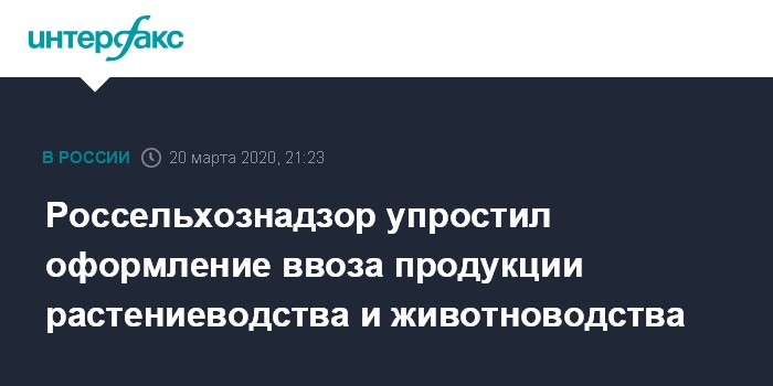 Москва. 20 марта. INTERFAX.RU - Россельхознадзор упрощает порядок оформления ввоза в Россию продукции растениеводства и животноводства.