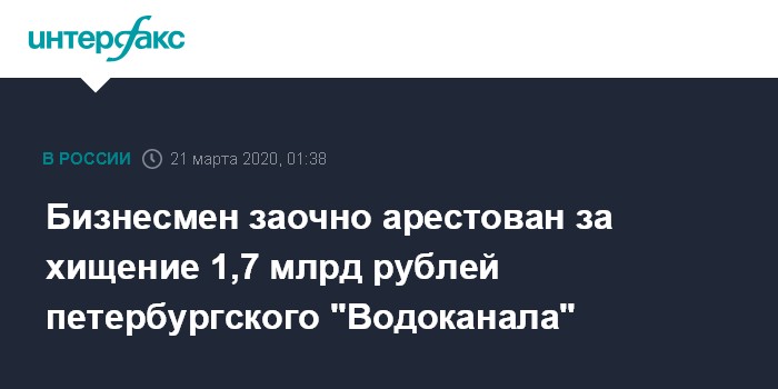 Бизнесмен заочно арестован за хищение 1,7 млрд рублей петербургского "Водоканала"
