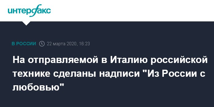 Москва. 22 марта. INTERFAX.RU - Надписи "Из России с любовью" на русском, английском и итальянском языках сделаны на технике, которую Минобороны России направляет в Италию в рамках помощи в борьбе с коронавирусом.