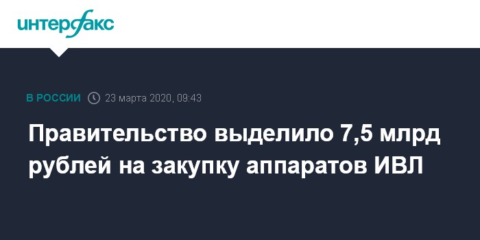Москва. 23 марта. INTERFAX.RU - Правительство выделило 7,5 млрд рублей на закупку аппаратов искусственной вентиляции легких и еще 5 млрд рублей - на закупку термометров и установок обеззараживания воздуха в федеральных министерствах и ведомствах, средства выделены Минпромторгу, следует из распоряжений на сайте правительства.