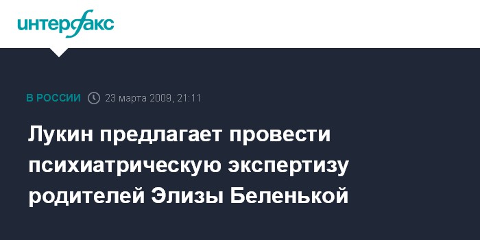 Сочи. 23 марта. INTERFAX.RU - Уполномоченный по правам человека в РФ Владимир Лукин считает, что, прежде чем решать судьбу Элизы Беленькой, необходимо провести психиатрическую экспертизу ее родителям.