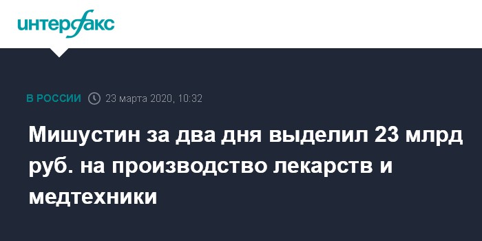 Москва. 23 марта. INTERFAX.RU - Правительство за последние два дня выделило больше 23 млрд рублей на производство медицинской и фармацевтической продукции, которая нужна для борьбы с коронавирусом, сообщил премьер-министр Михаил Мишустин на совещании с вице-премьерами.